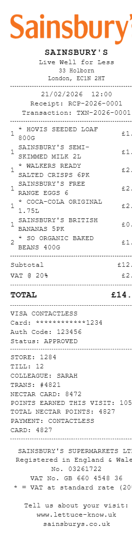 Preview our Sainsbury's receipt template below. This example shows the realistic layout and formatting you can expect. Every field is fully customizable — adjust items, prices, dates, and more to match your needs.