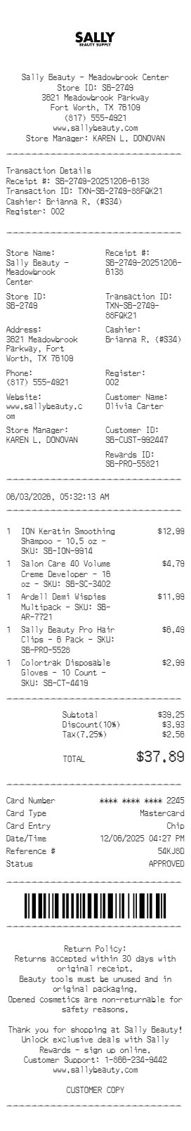 Preview our Sally receipt template below. This example shows the realistic layout and formatting you can expect. Every field is fully customizable — adjust items, prices, dates, and more to match your needs.