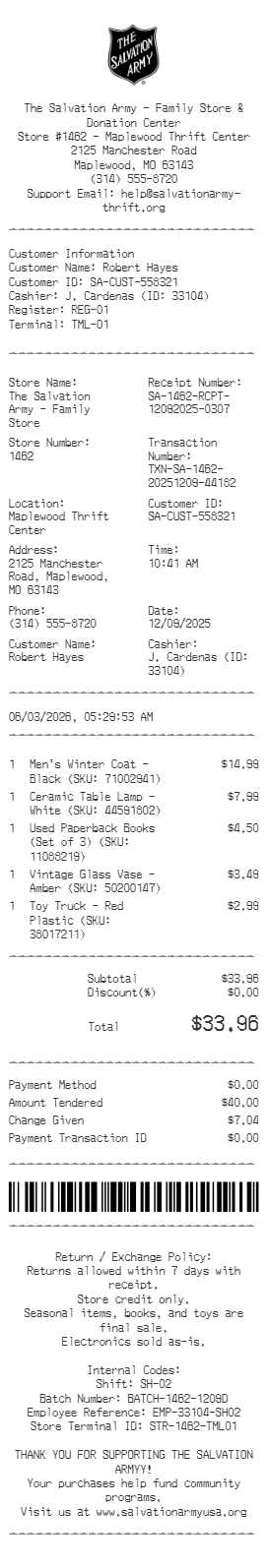 Preview our Salvation Army receipt template below. This example shows the realistic layout and formatting you can expect. Every field is fully customizable — adjust items, prices, dates, and more to match your needs.