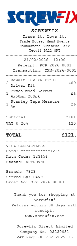 Preview our Screwfix receipt template below. This example shows the realistic layout and formatting you can expect. Every field is fully customizable — adjust items, prices, dates, and more to match your needs.