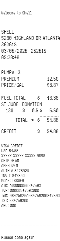 Preview our Shell receipt template below. This example shows the realistic layout and formatting you can expect. Every field is fully customizable — adjust items, prices, dates, and more to match your needs.
