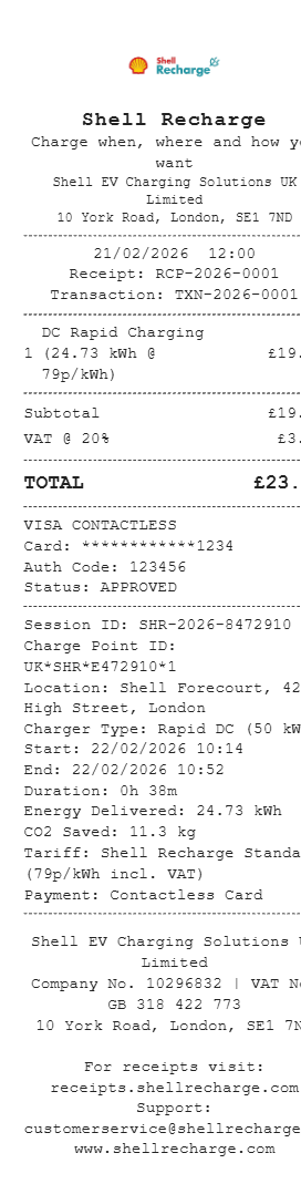 Preview our Shell Recharge receipt template below. This example shows the realistic layout and formatting you can expect. Every field is fully customizable — adjust items, prices, dates, and more to match your needs.