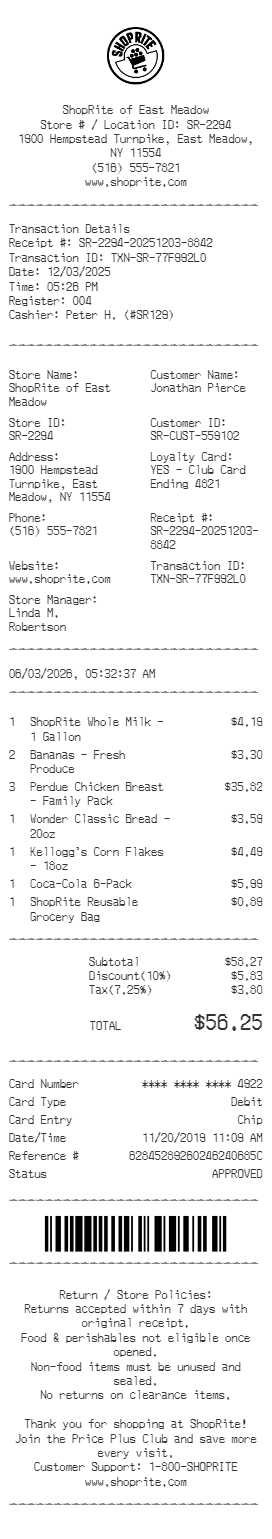 Preview our Shoprite receipt template below. This example shows the realistic layout and formatting you can expect. Every field is fully customizable — adjust items, prices, dates, and more to match your needs.