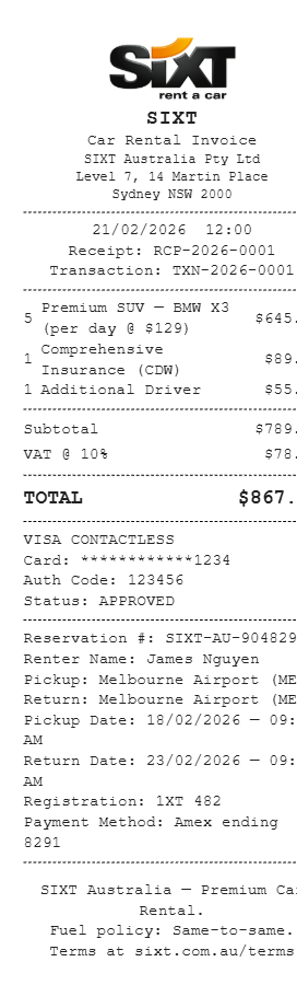 Preview our Sixt receipt template below. This example shows the realistic layout and formatting you can expect. Every field is fully customizable — adjust items, prices, dates, and more to match your needs.