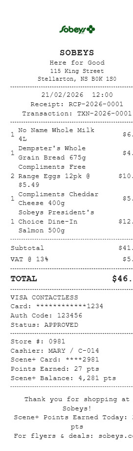 Preview our Sobeys Canada receipt template below. This example shows the realistic layout and formatting you can expect. Every field is fully customizable — adjust items, prices, dates, and more to match your needs.
