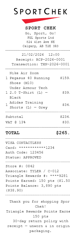 Preview our Sport Chek receipt template below. This example shows the realistic layout and formatting you can expect. Every field is fully customizable — adjust items, prices, dates, and more to match your needs.