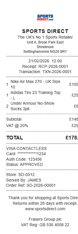 Preview our Sports Direct receipt template below. This example shows the realistic layout and formatting you can expect. Every field is fully customizable — adjust items, prices, dates, and more to match your needs.