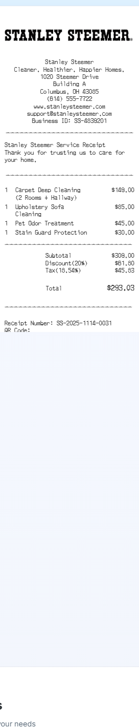 Preview our Stanley Steemer receipt template below. This example shows the realistic layout and formatting you can expect. Every field is fully customizable — adjust items, prices, dates, and more to match your needs.