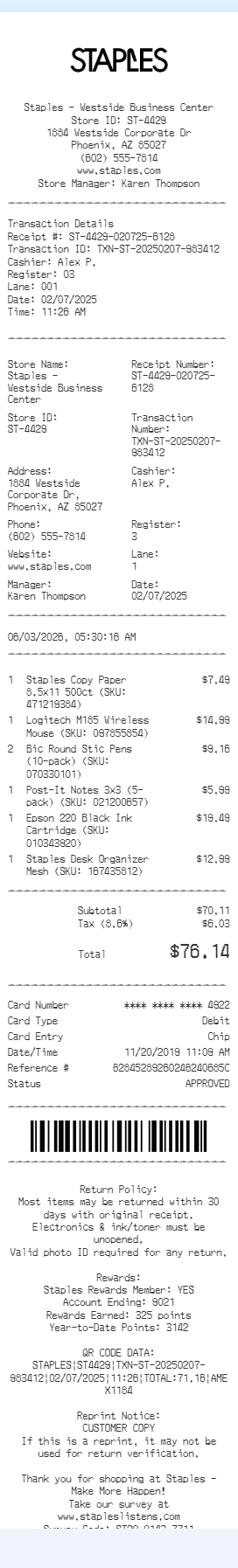 Preview our Staples receipt template below. This example shows the realistic layout and formatting you can expect. Every field is fully customizable — adjust items, prices, dates, and more to match your needs.
