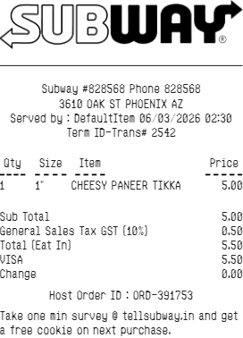 Preview our Subway receipt template below. This example shows the realistic layout and formatting you can expect. Every field is fully customizable — adjust items, prices, dates, and more to match your needs.