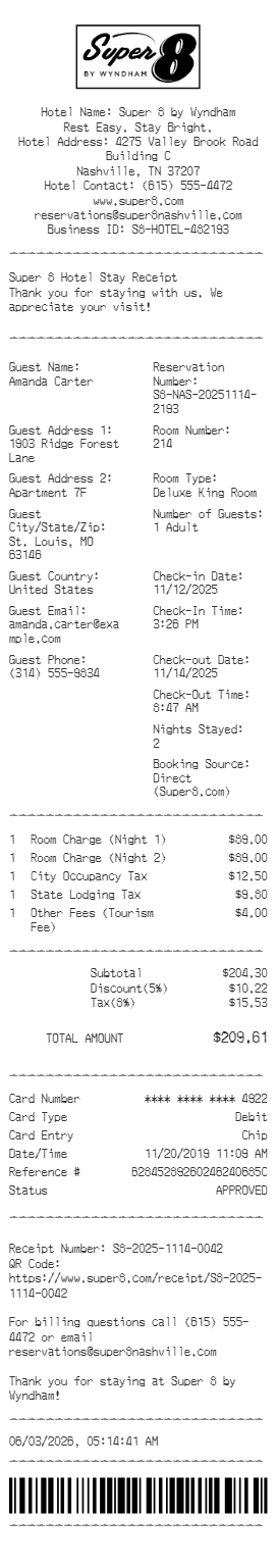 Preview our Super Eight receipt template below. This example shows the realistic layout and formatting you can expect. Every field is fully customizable — adjust items, prices, dates, and more to match your needs.