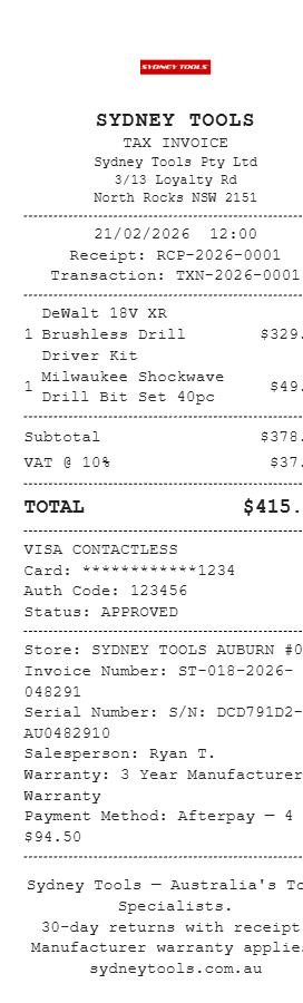 Preview our Sydney Tools receipt template below. This example shows the realistic layout and formatting you can expect. Every field is fully customizable — adjust items, prices, dates, and more to match your needs.