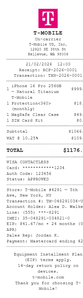 Preview our T-Mobile receipt template below. This example shows the realistic layout and formatting you can expect. Every field is fully customizable — adjust items, prices, dates, and more to match your needs.