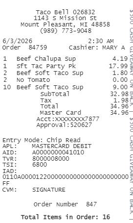 Preview our Taco Bell receipt template below. This example shows the realistic layout and formatting you can expect. Every field is fully customizable — adjust items, prices, dates, and more to match your needs.