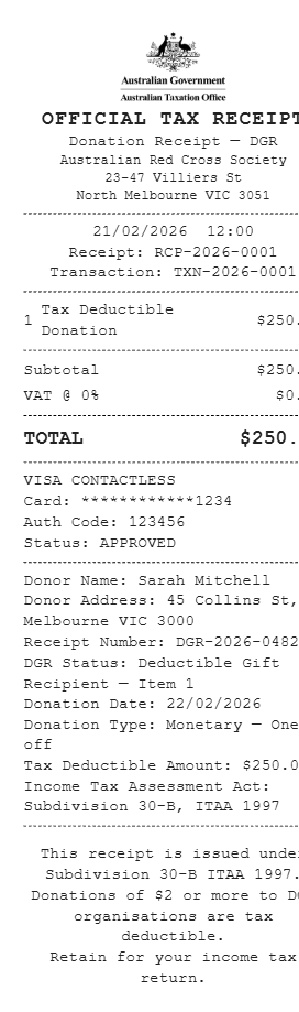 Preview our Tax Receipt Australia receipt template below. This example shows the realistic layout and formatting you can expect. Every field is fully customizable — adjust items, prices, dates, and more to match your needs.