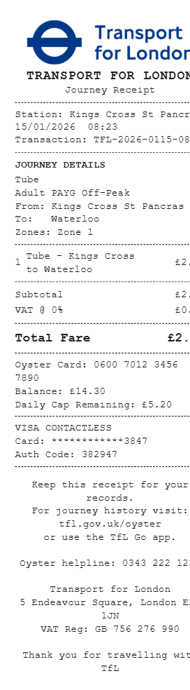 Preview our TfL receipt template below. This example shows the realistic layout and formatting you can expect. Every field is fully customizable — adjust items, prices, dates, and more to match your needs.