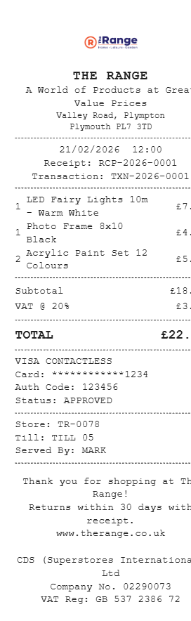 Preview our The Range receipt template below. This example shows the realistic layout and formatting you can expect. Every field is fully customizable — adjust items, prices, dates, and more to match your needs.