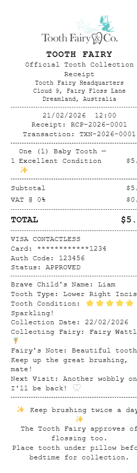 Preview our Tooth Fairy Receipt Australia receipt template below. This example shows the realistic layout and formatting you can expect. Every field is fully customizable — adjust items, prices, dates, and more to match your needs.