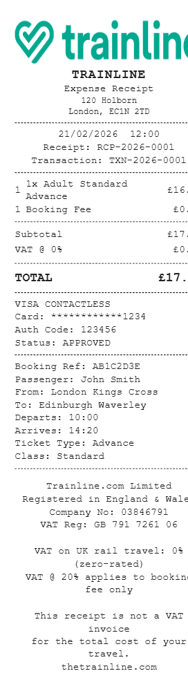 Preview our Trainline receipt template below. This example shows the realistic layout and formatting you can expect. Every field is fully customizable — adjust items, prices, dates, and more to match your needs.