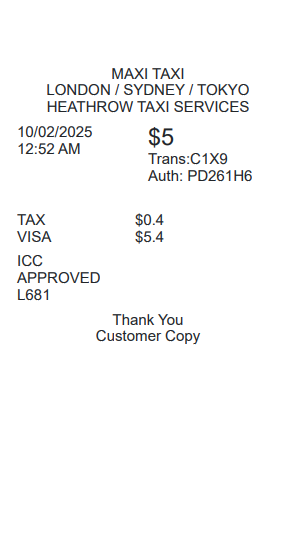 Preview our Transport receipt template below. This example shows the realistic layout and formatting you can expect. Every field is fully customizable — adjust items, prices, dates, and more to match your needs.