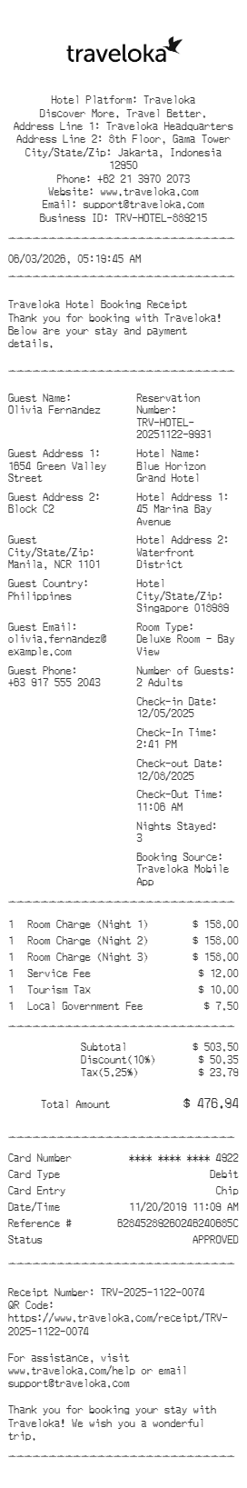 Preview our Traveloka receipt template below. This example shows the realistic layout and formatting you can expect. Every field is fully customizable — adjust items, prices, dates, and more to match your needs.
