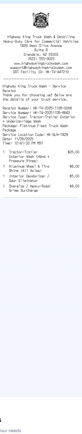 Preview our Truck Wash receipt template below. This example shows the realistic layout and formatting you can expect. Every field is fully customizable — adjust items, prices, dates, and more to match your needs.