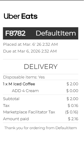 Preview our Uber Eats receipt template below. This example shows the realistic layout and formatting you can expect. Every field is fully customizable — adjust items, prices, dates, and more to match your needs.