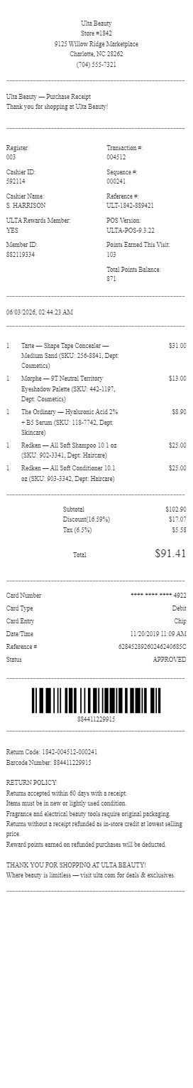 Preview our Ulta receipt template below. This example shows the realistic layout and formatting you can expect. Every field is fully customizable — adjust items, prices, dates, and more to match your needs.