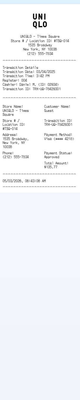 Preview our Uniqlo receipt template below. This example shows the realistic layout and formatting you can expect. Every field is fully customizable — adjust items, prices, dates, and more to match your needs.