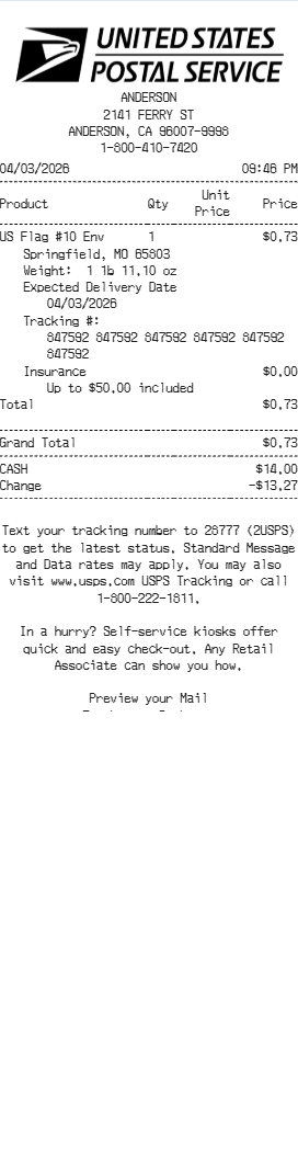Preview our Usps receipt template below. This example shows the realistic layout and formatting you can expect. Every field is fully customizable — adjust items, prices, dates, and more to match your needs.
