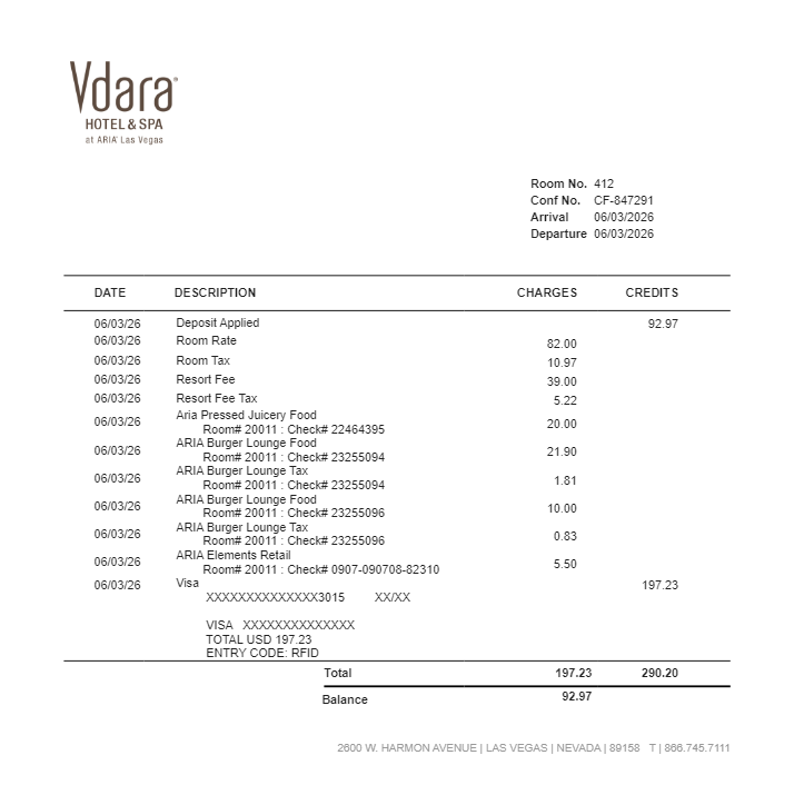 Preview our Vdara receipt template below. This example shows the realistic layout and formatting you can expect. Every field is fully customizable — adjust items, prices, dates, and more to match your needs.