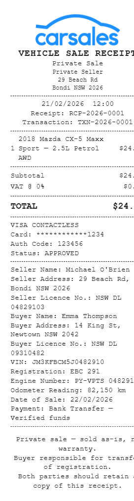 Preview our Vehicle Sale Receipt Australia receipt template below. This example shows the realistic layout and formatting you can expect. Every field is fully customizable — adjust items, prices, dates, and more to match your needs.