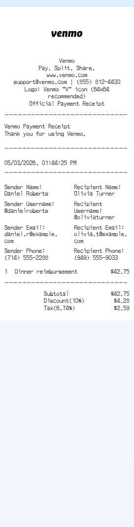Preview our Venmo receipt template below. This example shows the realistic layout and formatting you can expect. Every field is fully customizable — adjust items, prices, dates, and more to match your needs.