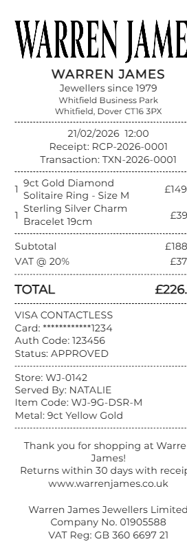 Preview our Warren James receipt template below. This example shows the realistic layout and formatting you can expect. Every field is fully customizable — adjust items, prices, dates, and more to match your needs.