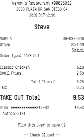 Preview our Wendy's receipt template below. This example shows the realistic layout and formatting you can expect. Every field is fully customizable — adjust items, prices, dates, and more to match your needs.