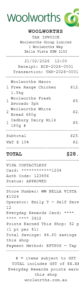 Preview our Woolworths receipt template below. This example shows the realistic layout and formatting you can expect. Every field is fully customizable — adjust items, prices, dates, and more to match your needs.
