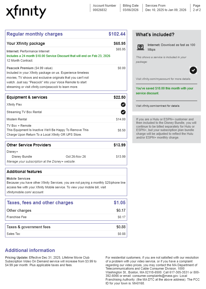 Preview our Xfinity receipt template below. This example shows the realistic layout and formatting you can expect. Every field is fully customizable — adjust items, prices, dates, and more to match your needs.