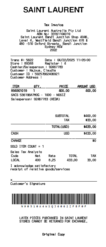 Preview our YSL receipt template below. This example shows the realistic layout and formatting you can expect. Every field is fully customizable — adjust items, prices, dates, and more to match your needs.